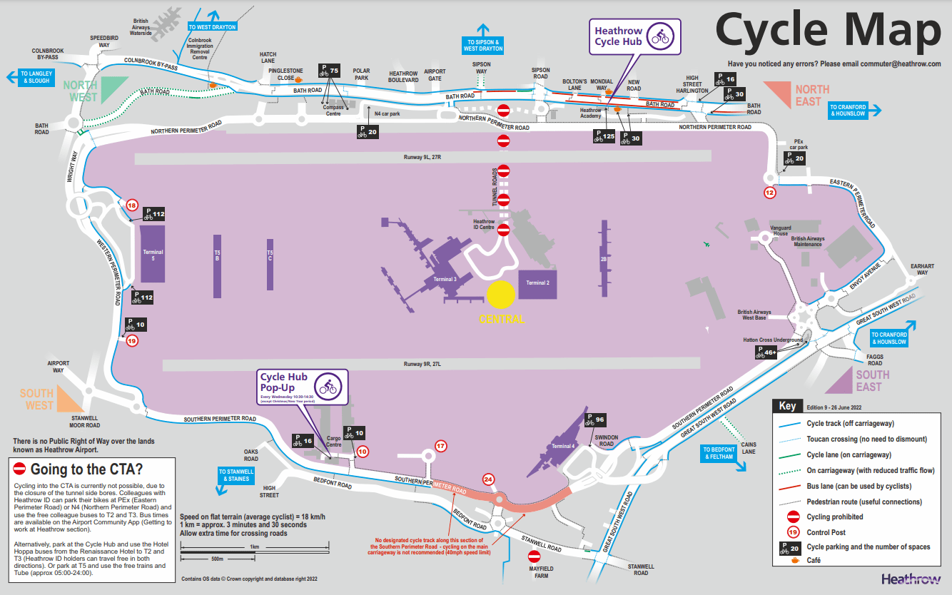 You can also reach the airport on a bicycle, and park it at the Heathrow Cycle Hub. There is a dedicated cycle map below that offers you a complete perspective of cycling to the airport: